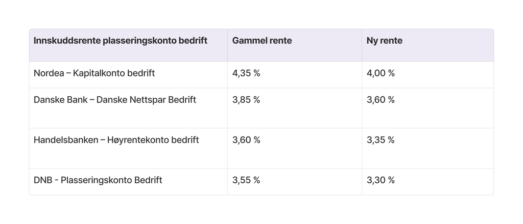 Etter rentekuttet i juni har alle bankene satt ned rentene på innskudd og utlån. I tabellen nedenfor viser vi ny og gammel rente på plasseringskonto for bedriftskunder i de største bankene. Alle storbankene har satt ned renten med 0,25 prosentpoeng, med unntak av Nordea, som nedjusterte med 0,35 prosentpoeng. Årsaken til at Nordea kuttet litt mer denne gangen kan være at de ligger vesentlig høyere enn konkurrentene på denne kontotypen.